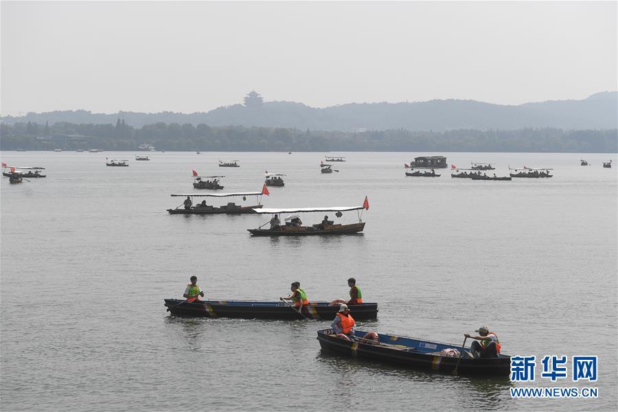 8月14日,游客乘船在西湖游玩(無(wú)人機(jī)拍攝)?! ⌒氯A社記者 翁忻旸 攝