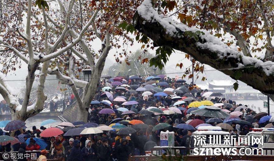 2018年12月8日,杭州,當日市區(qū)普降大雪,市民和游客扎堆涌入西湖景區(qū),拍攝最美雪景照片以及為自己留影。