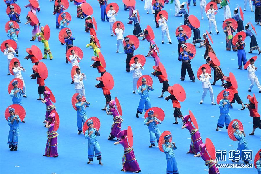 12月10日,廣西壯族自治區(qū)成立60周年慶祝大會在廣西體育中心隆重舉行。這是慶祝大會上的群眾文藝表演。 新華社記者 李鑫 攝