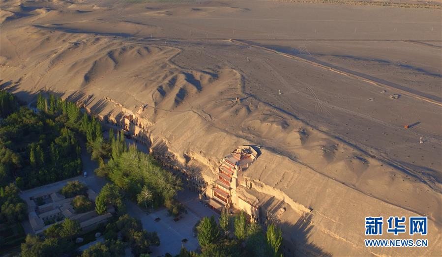 這是世界文化遺產(chǎn)莫高窟(2016年9月7日無人機(jī)拍攝)。 敦煌記錄歷史。開放的胸襟,曾讓這里成為古代絲綢之路上“華戎所交一都會(huì)”。 時(shí)隔千年,改革開放的春風(fēng)吹入西北內(nèi)陸小城,敦煌再度成為中國(guó)對(duì)外開放的文化前沿。 新華社記者 陳斌 攝