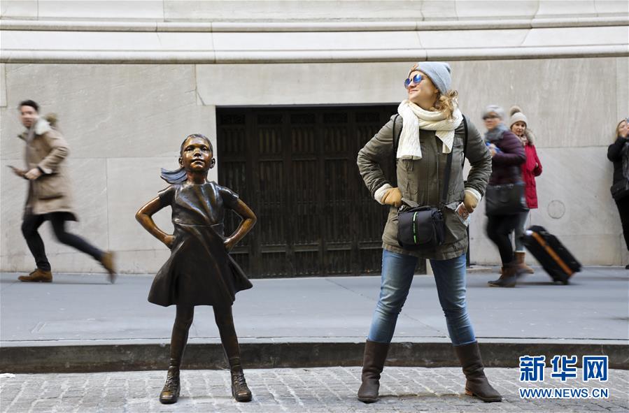 12月10日,在美國紐約,一名女士與紐約證券交易所前的“無畏女孩”銅像合影。 新華社記者 王迎 攝
