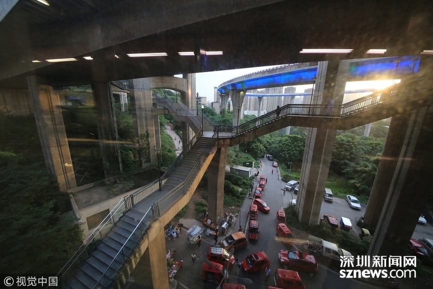 2018年5月29日,重慶,魔幻重慶又雙叒叕放大招!還有一個獨(dú)特的亮點(diǎn),重慶軌道交通3號線銅元局站,出口由一段長梯銜接上方立交橋和下方的路面,與全國最高城市立交橋蘇家壩立交組成了獨(dú)特風(fēng)景,許多游客專門趕來拍照。