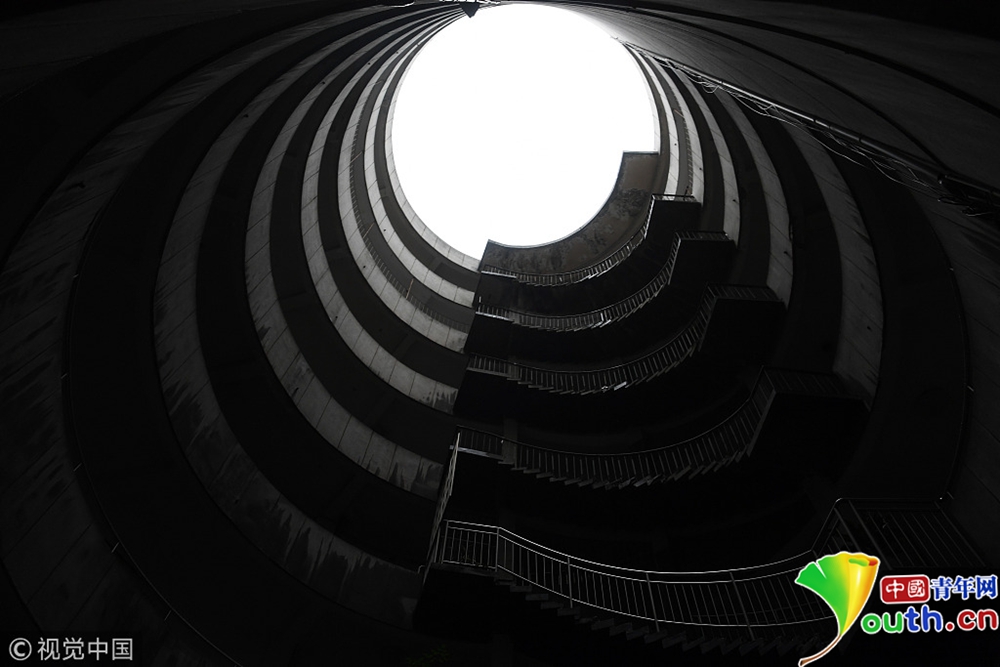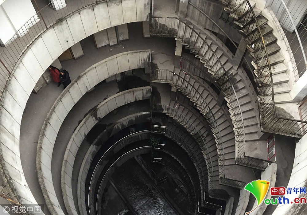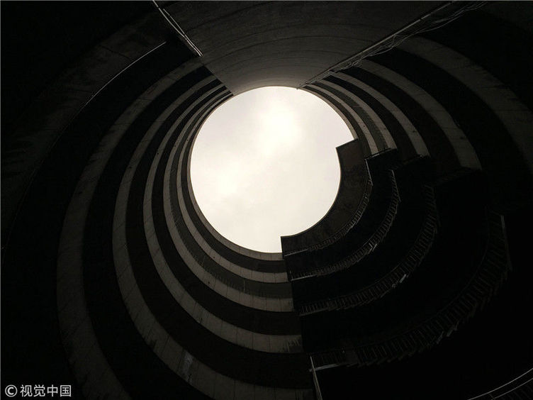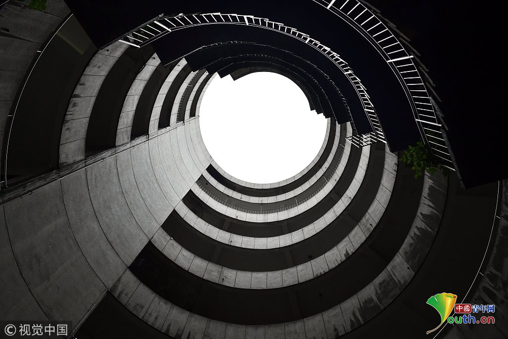 2017年9月27日,重慶,南岸區(qū)某小區(qū)的“螺旋”停車場,從公路到車庫要下5層樓,司機需要轉無數(shù)個360度圈。圖片來源:視覺中國