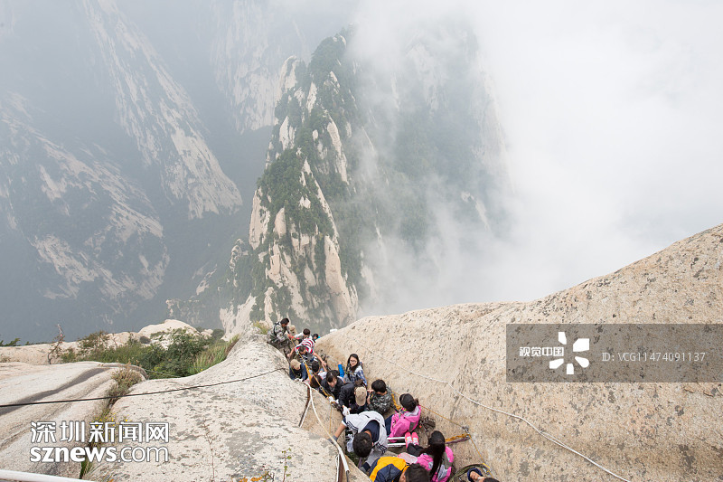 2015年09月18日,陜西渭南,西岳華山歷來被認(rèn)為是五岳之中最為險(xiǎn)峻的,而在華山中,險(xiǎn)中之險(xiǎn)莫過于“長(zhǎng)空棧道”和“鷂子翻身”。華山長(zhǎng)空棧道位于華山南峰東側(cè)山腰,是一條具有七百多年歷史的古棧道。棧道上下皆是懸崖絕壁由30多厘米寬的木板和條石搭成,下面是萬丈深淵,僅靠一條鐵索作為抓手,被喻為“華山第一天險(xiǎn)”。