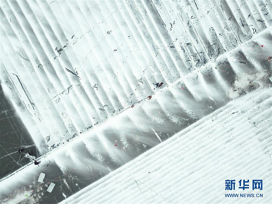 在松花江哈爾濱段江面,工人們?cè)谶M(jìn)行切割和采冰工作(12月12日無(wú)人機(jī)拍攝)。 黑龍江哈爾濱市的冰雪主題樂(lè)園哈爾濱冰雪大世界的采冰和建設(shè)工作近日拉開帷幕。為保證足夠的優(yōu)質(zhì)冰供給,每天有近千名采冰人和700多輛運(yùn)冰車參與到采冰工作。 新華社記者 王松 攝