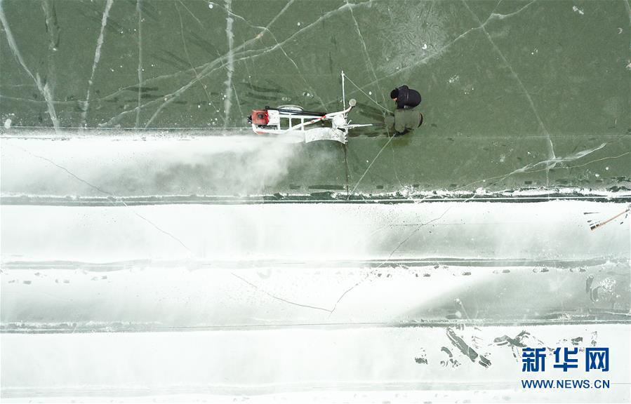 在松花江哈爾濱段江面,工人們在進行切割和采冰工作(12月12日無人機拍攝)。 黑龍江哈爾濱市的冰雪主題樂園哈爾濱冰雪大世界的采冰和建設(shè)工作近日拉開帷幕。為保證足夠的優(yōu)質(zhì)冰供給,每天有近千名采冰人和700多輛運冰車參與到采冰工作。 新華社記者 王松 攝