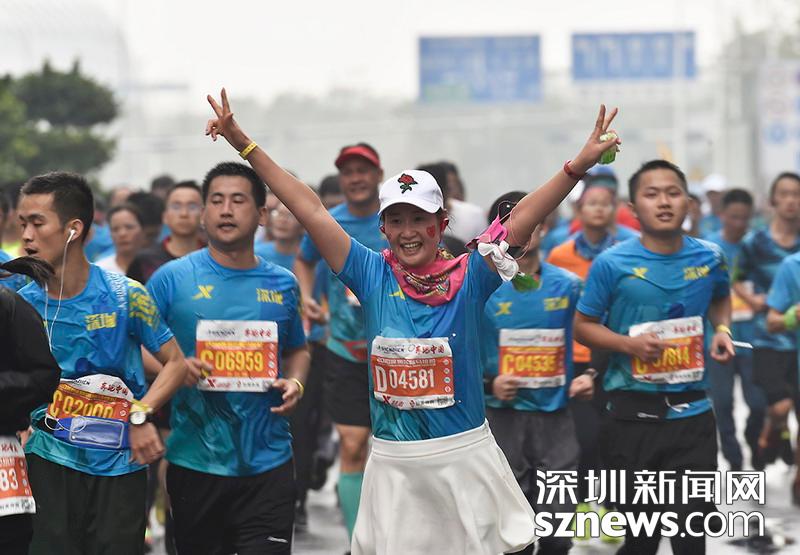 2018年12月16日,深圳國(guó)際馬拉松位于后海的折返點(diǎn),即將抵達(dá)終點(diǎn),一名選手歡呼雀躍。