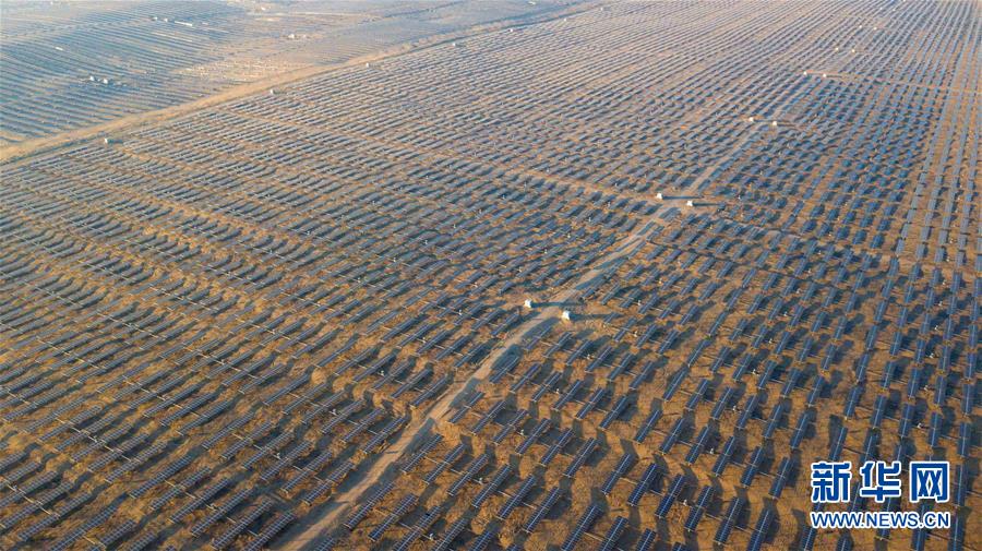 位于庫布其沙漠腹地的達拉特光伏發(fā)電應用領跑基地一期500兆瓦項目(12月13日無人機拍攝)。 新華社記者 彭源攝
