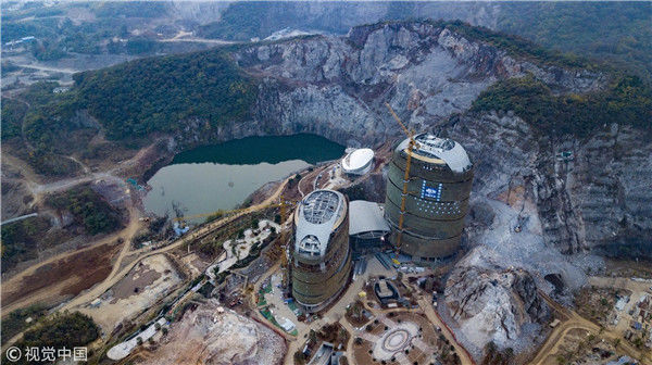 2017年11月15日,航拍南京老山一處百米懸崖邊,拔地而起的在建酒店酷似兩個“外星人基地”。