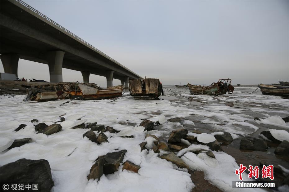 12月9日,受大風(fēng)降溫天氣影響,青島膠州灣北部冰情初現(xiàn),青島西海岸新區(qū)膠州灣跨海大橋入口處海冰層層疊疊,暫未對(duì)海上漁業(yè)生產(chǎn)帶來影響。張進(jìn)剛 攝 圖片來源:視覺中國