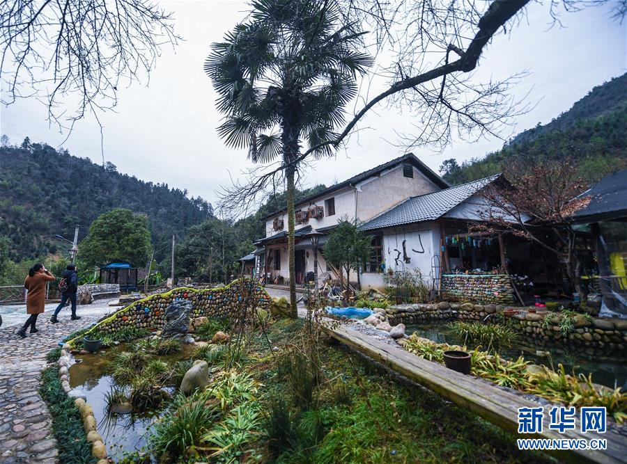 12月19日,客人走進(jìn)民宿“僻地寒樓”。該民宿共有7幢風(fēng)格各異的小屋分布在山坡上,頗具特色。河橋鎮(zhèn)青年張雁辭去了上海的工作,回到家鄉(xiāng)開辦了這家民宿。  新華社記者 徐昱 攝