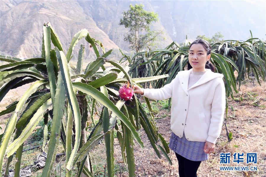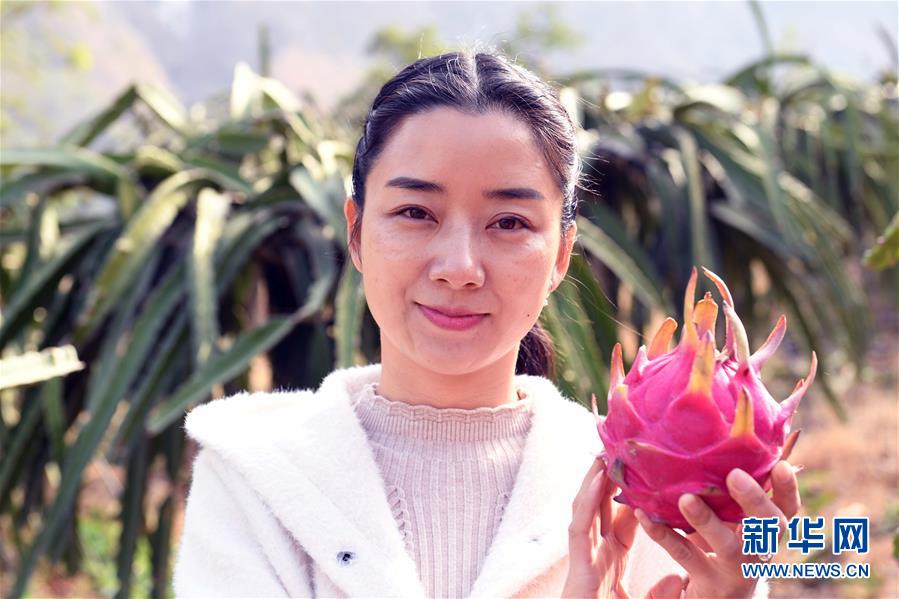 12月17日,徐慶在展示自己公司種植的火龍果。徐慶種植的火龍果出名,人又長(zhǎng)得秀氣,被稱為“小龍女”。徐慶曾經(jīng)在昆明某雜志社當(dāng)過(guò)編輯,做過(guò)生意,生活舒適。2013年,徐慶來(lái)到東川投資,把大荒地村泥石流荒灘變成綠洲,2017年種植火龍果300畝獲得豐收。村民們把土地統(tǒng)一出租,除了收取地租外,還在徐慶的果園里打工掙錢(qián)。同時(shí),村民把產(chǎn)業(yè)扶貧資金入股徐慶的公司,每年參與分紅。 新華社記者 楊宗友 攝