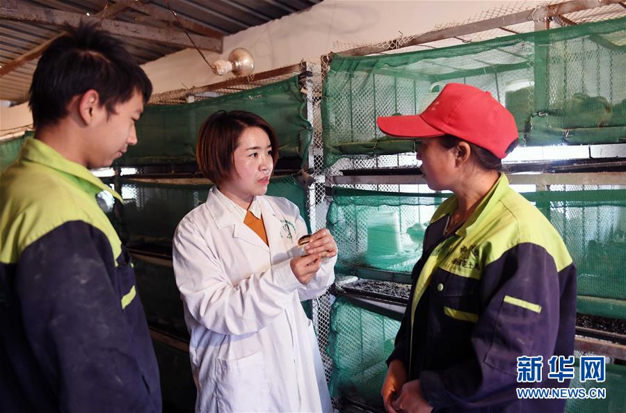12月18日,馬關琴(中)在雞苗育雛基地與工人交流。 新華社記者 楊宗友 攝