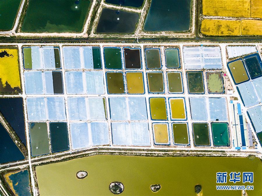 2018年9月11日航拍的寧夏賀蘭縣藍灣生態(tài)園南美對蝦養(yǎng)殖基地。 大地之色,俯仰之間;壯美山河,是我的祖國。2018年,新華社記者操縱無人機“飛閱”華夏大地,在最美的時節(jié),定格下她的色彩斑斕。 新華社記者 王建華 攝