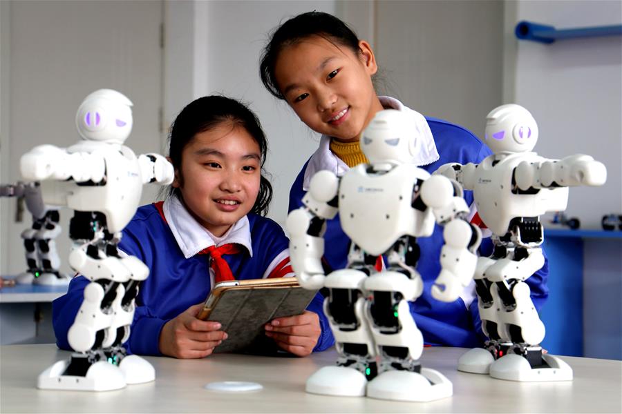 12月19日,武安市淑村鎮(zhèn)白沙學校的學生在練習操作機器人。新華社記者王曉攝