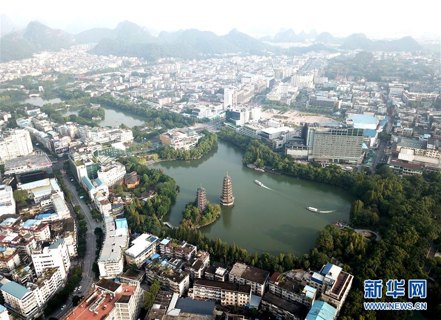 游船在廣西桂林市杉湖湖面上穿行(10月17日無人機(jī)拍攝)。 新華社記者 周華 攝