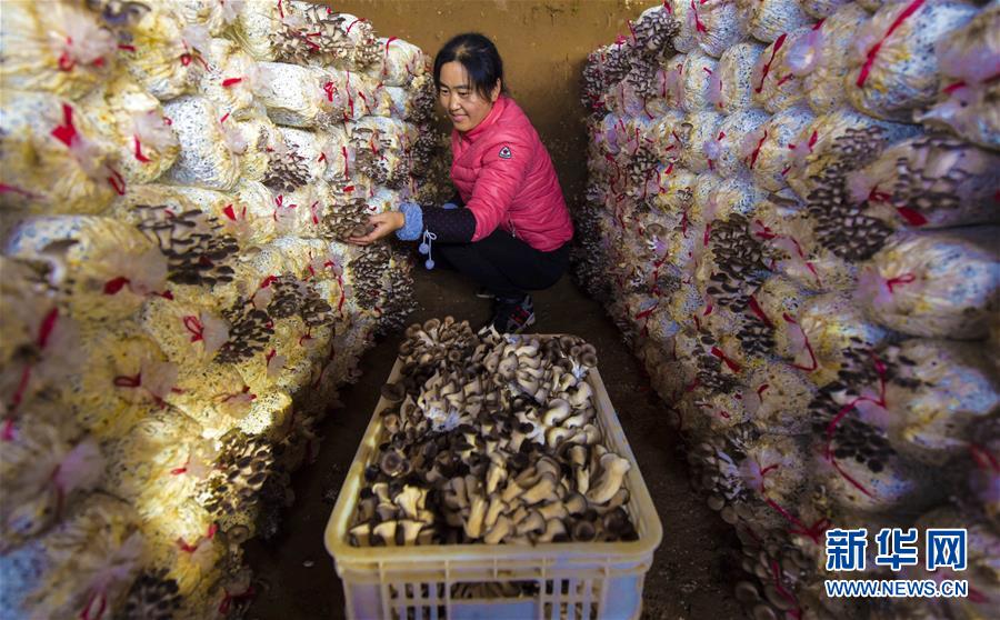 11月18日,在衡水市冀州區(qū)周村鎮(zhèn)東高村食用菌種植基地的大棚里,村民在采摘蘑菇。