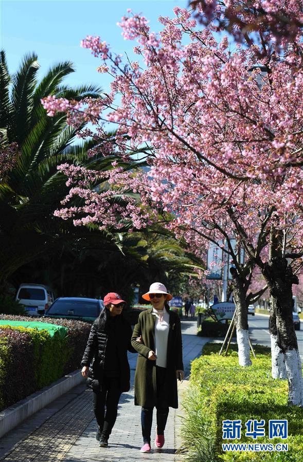 12月21日,游客在昆明市西山區(qū)一人行道上觀賞盛開(kāi)的櫻花。新華社記者楊宗友攝