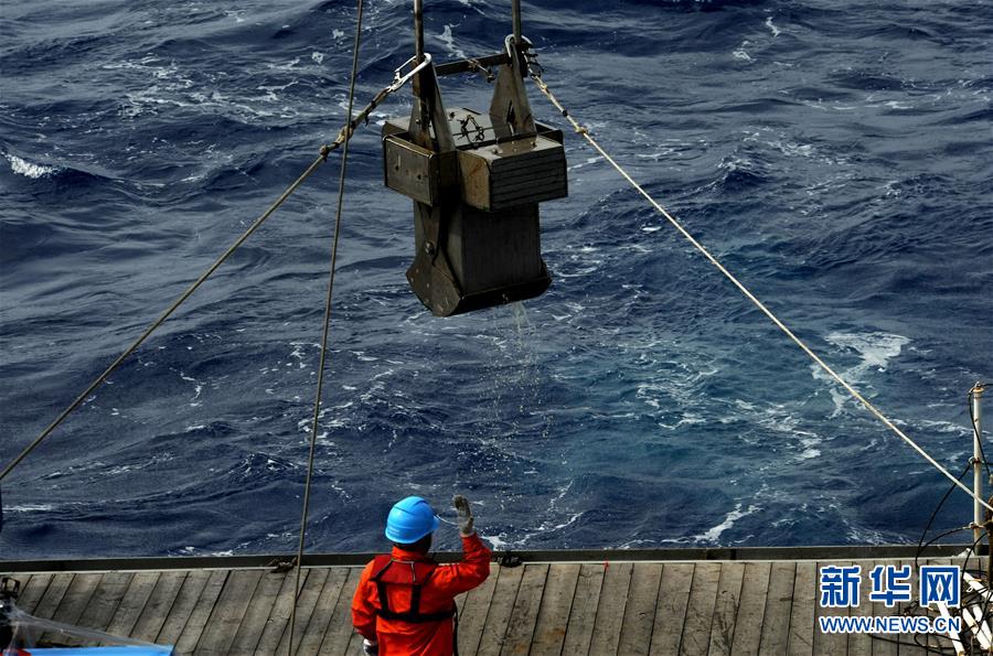 科考團(tuán)隊(duì)成員在船上布放箱式采樣器(12月19日攝)。