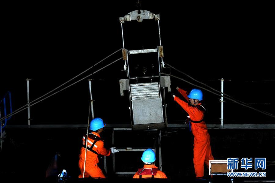 科考團(tuán)隊(duì)成員在船上布放重力柱(12月21日攝)。