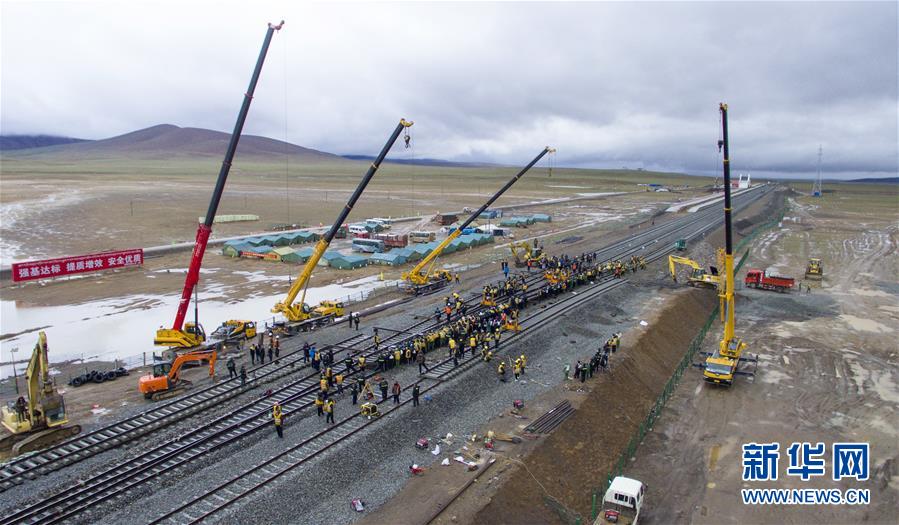 這是2017年7月26日無人機拍攝的青藏鐵路格爾木至拉薩段擴能改造工程唐古拉車站撥接工作現場。 新華社記者 劉東君 攝