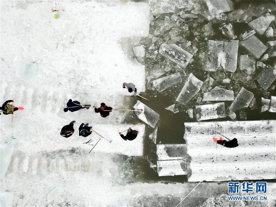 在松花江哈爾濱段江面,工人們?cè)谶M(jìn)行切割和采冰工作(12月12日無(wú)人機(jī)拍攝)。 黑龍江哈爾濱市的冰雪主題樂(lè)園哈爾濱冰雪大世界的采冰和建設(shè)工作近日拉開帷幕。為保證足夠的優(yōu)質(zhì)冰供給,每天有近千名采冰人和700多輛運(yùn)冰車參與到采冰工作。 新華社記者 王松 攝