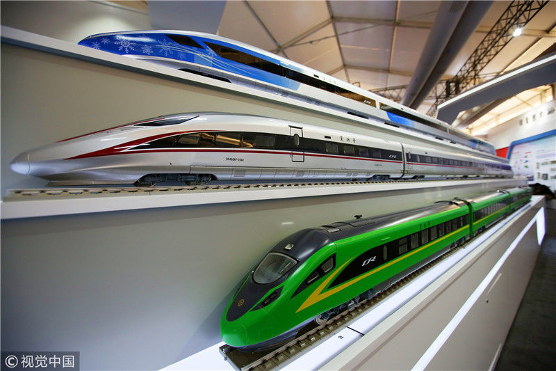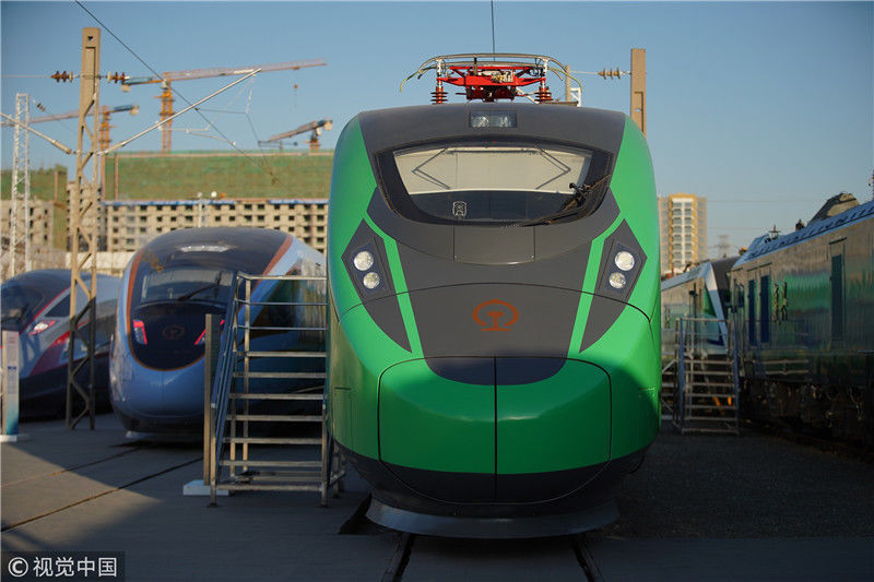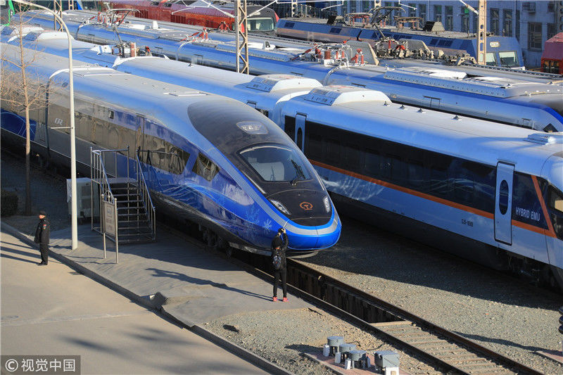 2018年12月24日,北京,中國(guó)鐵路科技創(chuàng)新成果展在國(guó)家鐵道試驗(yàn)中心舉行。新型復(fù)興號(hào)動(dòng)車(chē)組實(shí)車(chē)首次公開(kāi)亮相,現(xiàn)場(chǎng)體驗(yàn)乘車(chē)運(yùn)行。視覺(jué)中國(guó)