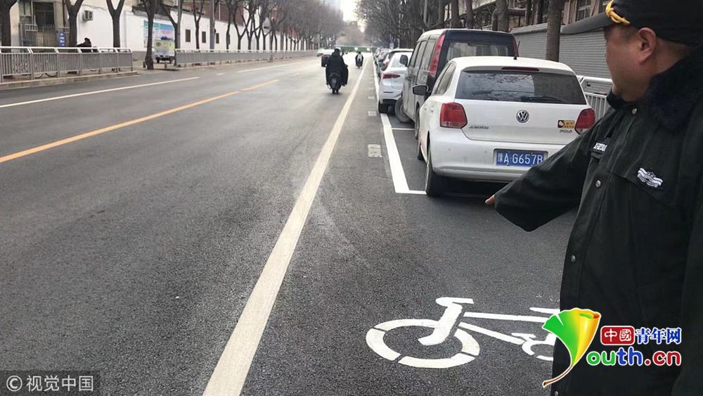“你看看,自行車道被新劃的停車位占住了,路邊沒有停車還好,一旦有汽車,我騎車只能走快車道,基本沒有騎車的位置了?!笔忻駨埾壬f,“這里最多能容下一輛電動車通行,不走機動車道你說走哪?”