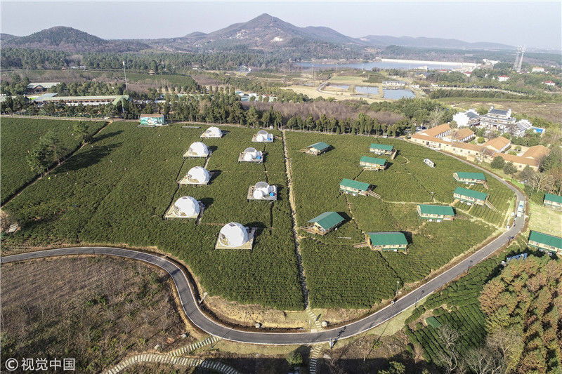 2018年12月18日,江蘇常州金壇茅山百畝茶田中的帳篷酒店和泡泡屋美不勝收。這里打造的帳篷,泡泡屋極具特色,可以讓游客與大自然零距離接觸,這種形式的“酒店”十分撩人,深受歡迎。韓加君/視覺中國