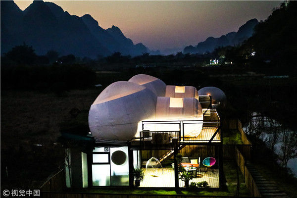 “泡泡屋”列陣陽朔河畔 游客可躺在床上看星星