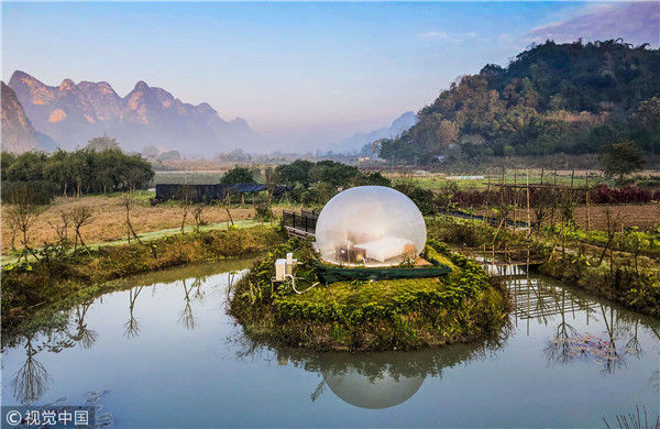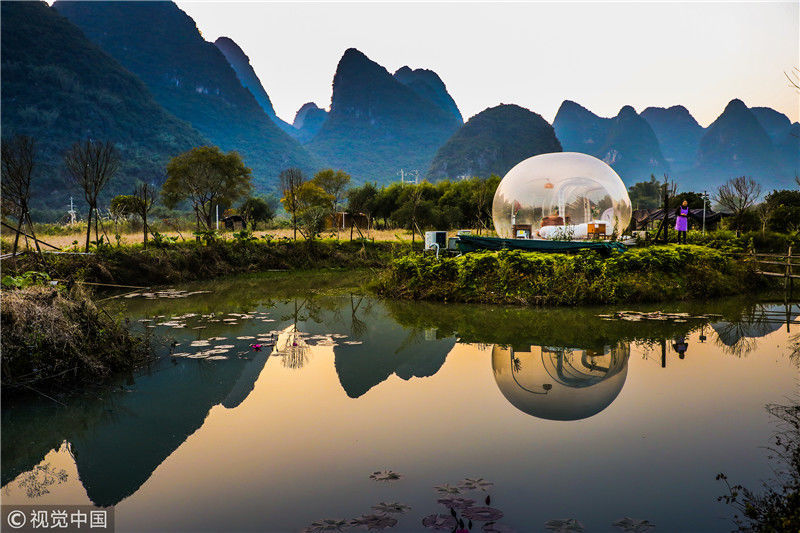 最近這幾年,中國的民宿風(fēng)越刮越猛,各地精品民宿紛紛如雨后春筍一樣冒出了,而且他們用其更獨特的設(shè)計感吸引著人們的目光。其實對比星級酒店,民宿最大的優(yōu)勢,就是設(shè)計風(fēng)格更獨特,更具藝術(shù)感,也更符合人們的審美要求,同時又能做到比星級酒店更舒適,更適合度假,所以大家現(xiàn)在出行都更熱衷于選擇民宿。圖為2018年12月18日,廣西桂林,陽朔縣遇龍河畔。晨光中的泡泡屋。棋簿紫/視覺中國