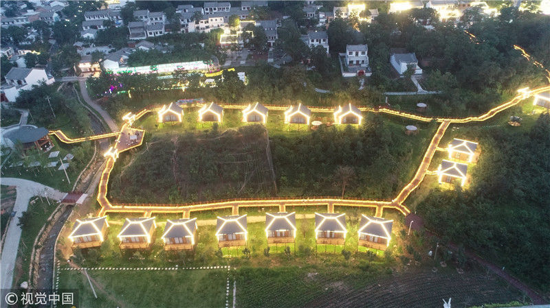 2018年7月6日,航拍陜西渭南臨渭區(qū)天留山下的小木屋民俗酒店。王警/視覺中國