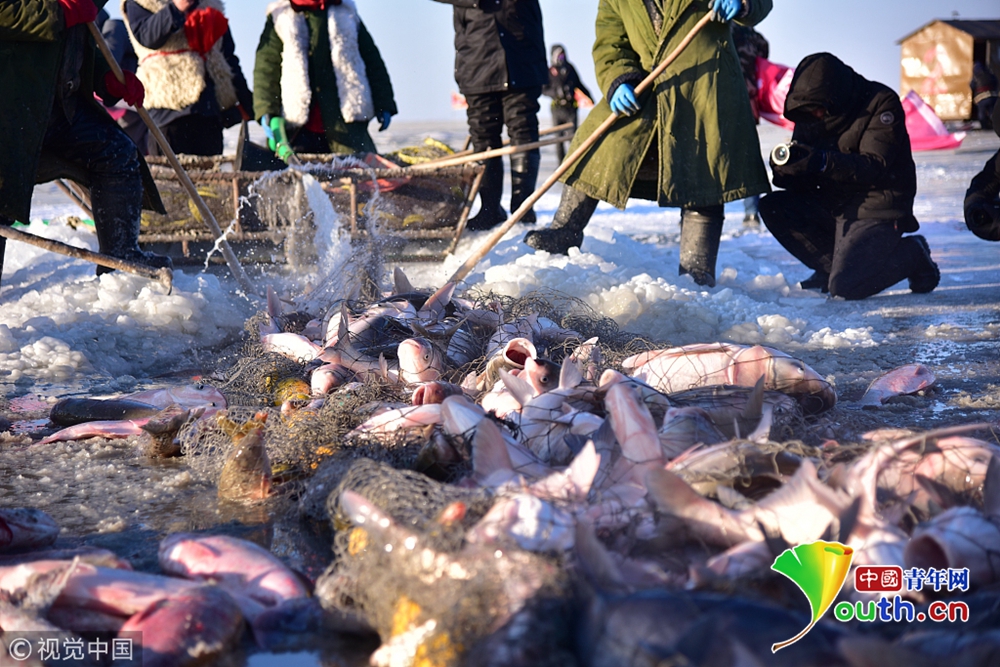 2018年12月26日,吉林松原,查干湖迎來了“紅網(wǎng)”,單網(wǎng)捕撈約30萬斤。