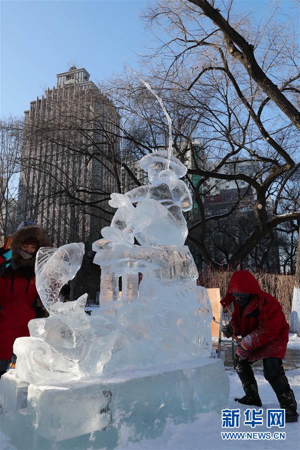 12月27日,選手們在比賽中完善冰雕作品。 當日,第十六屆黑龍江省大學生冰雕藝術設計創(chuàng)作大賽在哈爾濱兆麟公園落下帷幕,全省高校共有99支隊伍參賽。 新華社記者曹霽陽攝