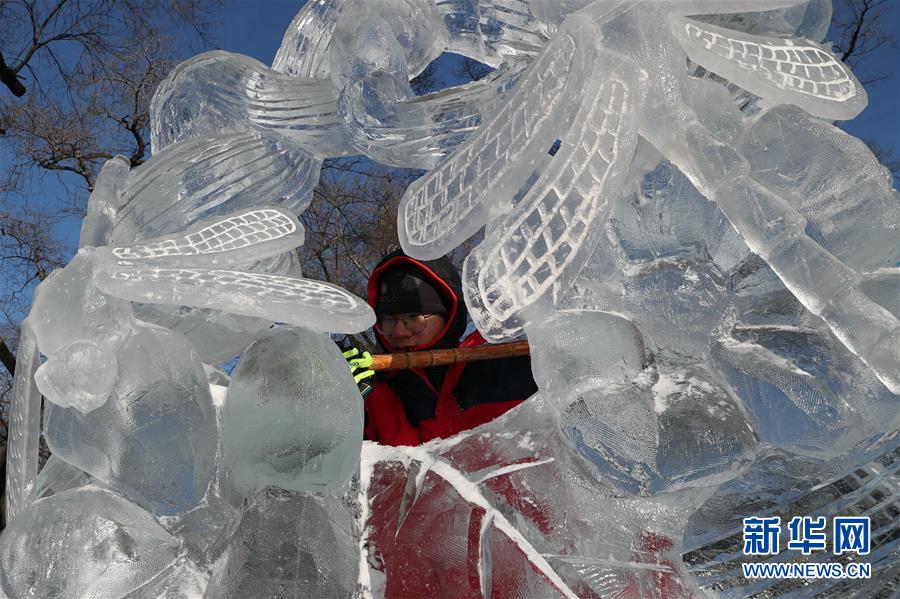 12月27日,選手們在比賽中完善冰雕作品。 當日,第十六屆黑龍江省大學生冰雕藝術設計創(chuàng)作大賽在哈爾濱兆麟公園落下帷幕,全省高校共有99支隊伍參賽。 新華社記者曹霽陽攝