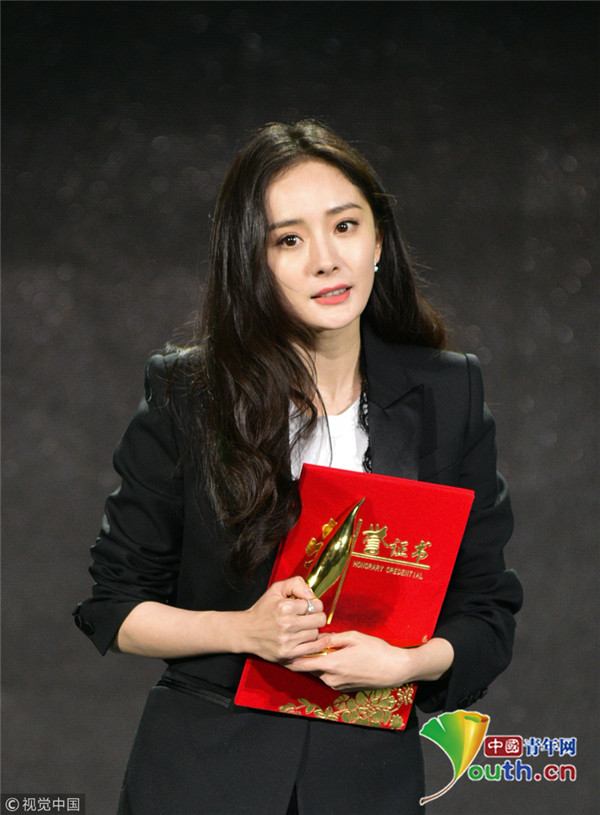 楊冪上臺領(lǐng)獎西裝精致干練 談話間舉手顯呆萌