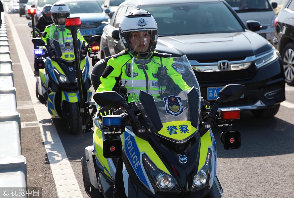 “江北新區(qū)分局交警支隊(duì)大橋特勤隊(duì)”的騎警隊(duì)員身著靚麗的熒光綠制服,騎行在南京長(zhǎng)江大橋上巡邏。