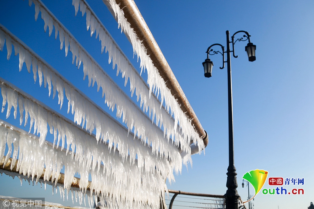 渤海海水在北風(fēng)的作用下涌向岸邊,在大連東港海岸護(hù)欄上凝結(jié)成冰凌,形成約有兩公里的冰凌奇觀。圖為大連市東港海岸護(hù)欄結(jié)滿晶瑩剔透的冰棱。圖片來(lái)源:視覺中國(guó)
