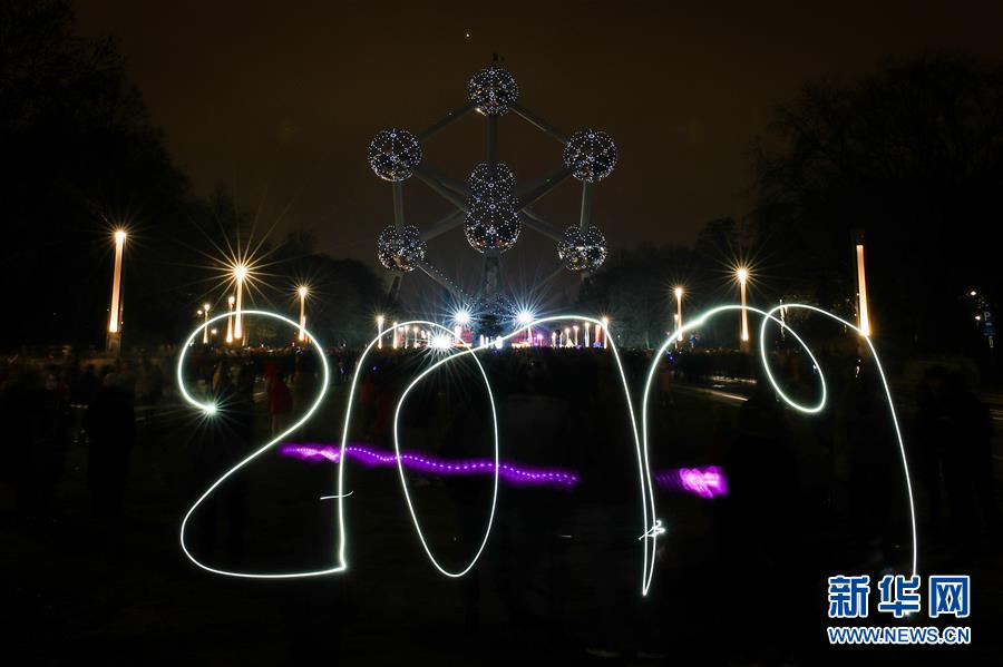 2018年12月31日,游客在比利時(shí)首都布魯塞爾的地標(biāo)性建筑——原子球塔前用光繪出2019的字樣,迎接即將到來(lái)的2019年。 新華社記者鄭煥松攝