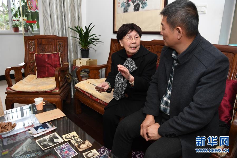 在原“福建前線廣播電臺”廣播員陳菲菲廈門的家中,陳菲菲老人向到訪的臺胞陳清隆訴說當年廈門向金門廣播的歷史(2018年12月30日攝)。 新華社記者 姜克紅 攝