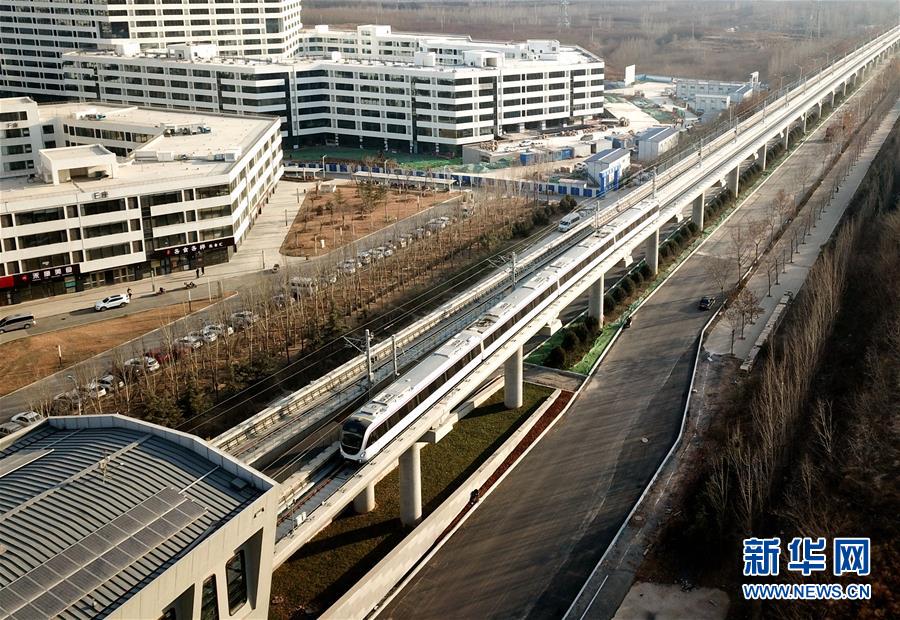 這是2018年12月29日無人機(jī)拍攝的車輛通過濟(jì)南軌道交通1號線創(chuàng)新谷站。新華社記者朱崢攝