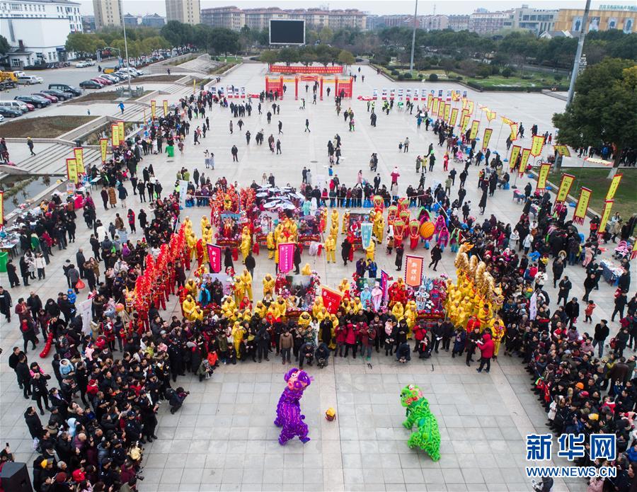 1月1日,演員在展演活動(dòng)上進(jìn)行舞龍舞獅等非遺傳統(tǒng)文化表演(無人機(jī)拍攝)。2019年元旦,浙江省桐鄉(xiāng)市濮院鎮(zhèn)舉辦新年“非遺文化藝術(shù)節(jié)”活動(dòng),濮院鎮(zhèn)下屬多個(gè)鄉(xiāng)村的傳統(tǒng)美食制作、手工藝品、非遺文化表演等鄉(xiāng)村特色非遺項(xiàng)目在濮院鎮(zhèn)中心廣場進(jìn)行集中展示展演。新華社記者 徐昱 攝