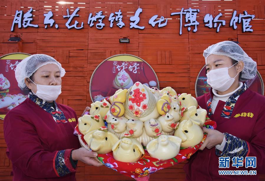 1月8日,工作人員展示一款賀壽團圓的花餑餑。