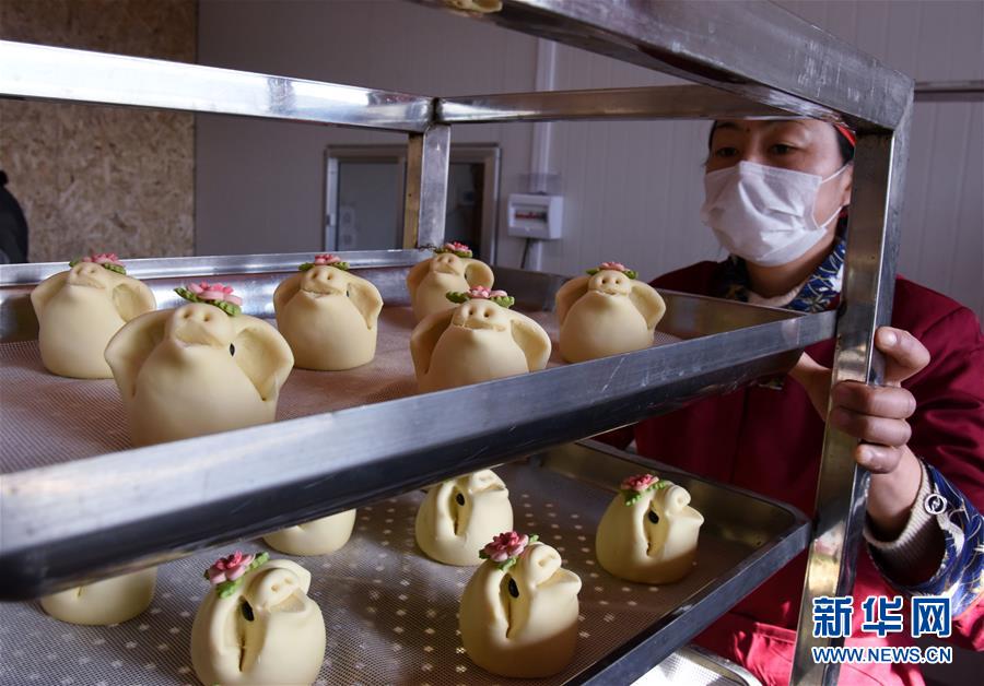 1月8日,工作人員準(zhǔn)備將做好的花餑餑放入蒸箱。 新華社記者 李紫恒 攝