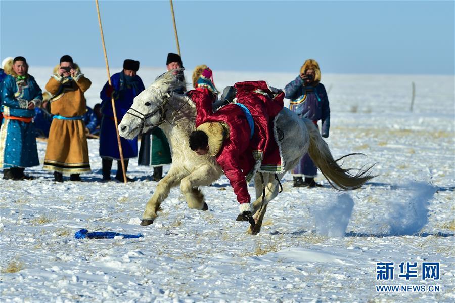 1月8日,牧民表演馬背拾哈達。 時下正值草原冬季旅游旺季,內蒙古自治區(qū)西烏珠穆沁旗的牧民們在雪原上一展身手,為游客展現(xiàn)獨特的民族風情。 新華社記者 鄒予 攝