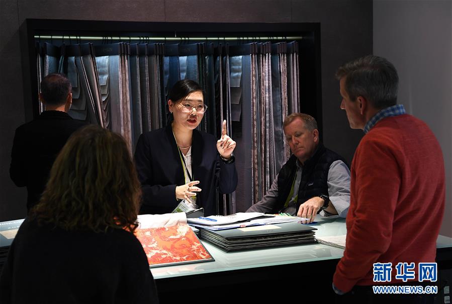 1月8日,在德國(guó)法蘭克福家紡展上,參觀者與一家來自中國(guó)的展商洽談。 新華社記者 逯陽 攝