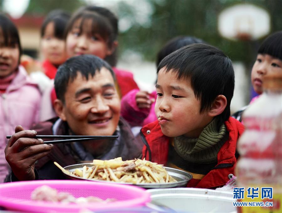 1月3日,章站亮(前左)給一位學(xué)生品嘗剛出鍋的土豆燒肉。 新華社記者 胡晨歡 攝