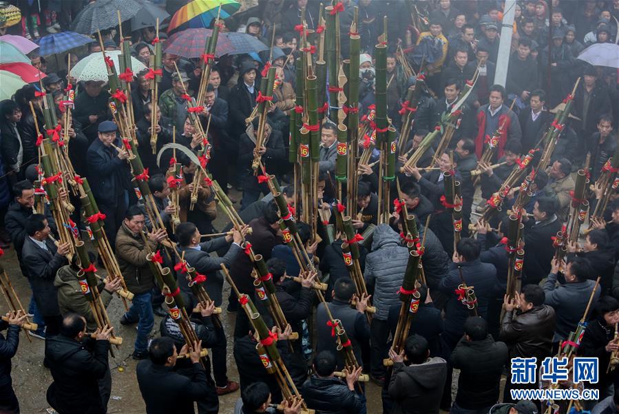 1月14日,人們?cè)趶V西融水苗族自治縣紅水鄉(xiāng)舉行的蘆笙節(jié)上賽蘆笙。