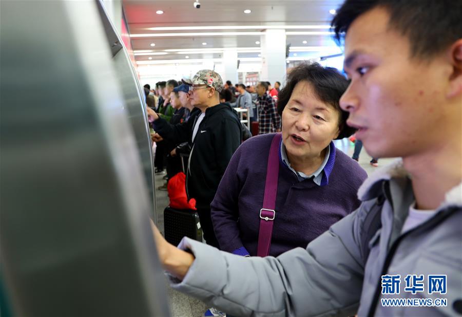 1月15日,廣東湛江青年許東濱(右)在廣州火車站售票大廳內(nèi)的自助售票終端上買完車票后,順便幫助一位老人查詢車票信息。 為適應互聯(lián)網(wǎng)購票旅客比重持續(xù)上升趨勢,廣州火車站在籌備2019年春運票務業(yè)務時,優(yōu)化互聯(lián)網(wǎng)購票取票和退改簽業(yè)務辦理流程設計,提升效率,方便旅客出行。 新華社記者劉大偉攝