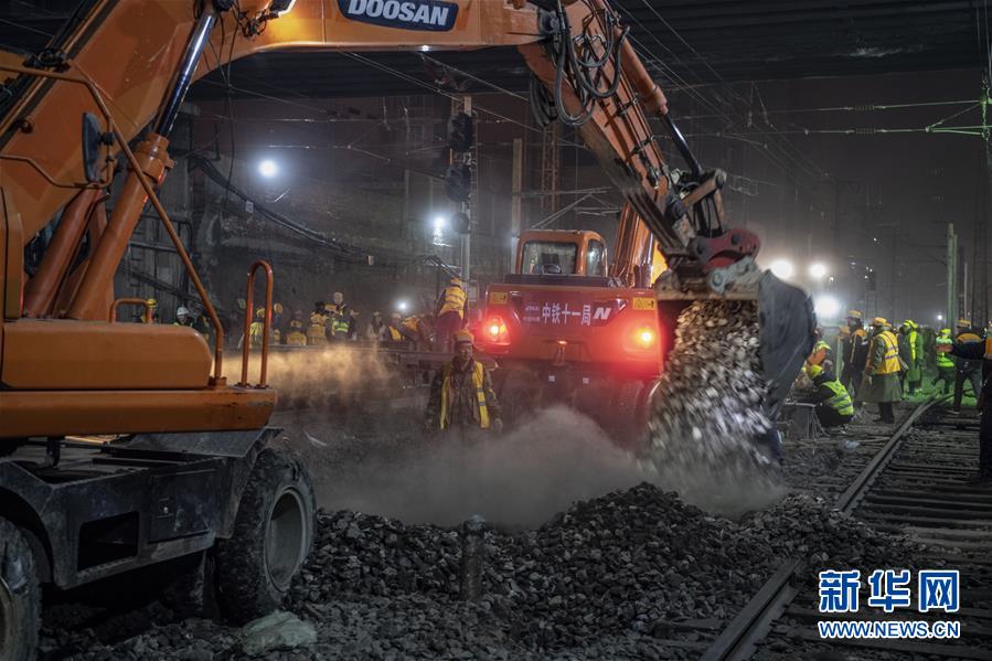 1月15日凌晨,中鐵十一局施工人員在西安站改現(xiàn)場(chǎng)緊張施工。新華社記者陶明攝